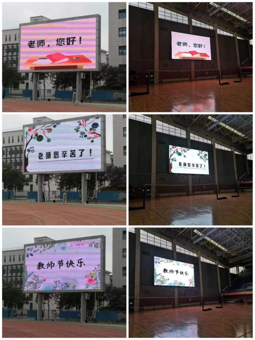在田径场利用LED屏“为教师亮灯”,滚动播放“教师节快乐”、“老师,您辛苦了”等图片来表达对老师节日的祝福。