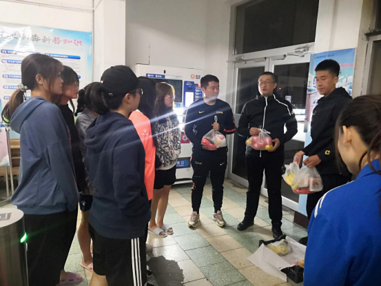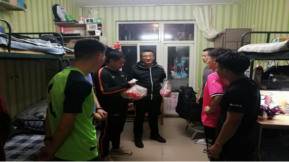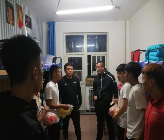 庆祝国庆,欢度中秋。2020年9月30日,太阳集团tyc4633(足球学院)副主任(副院长)苗凯、体育教育系主任王丰、团总支书记闫智惠、2019级班主任杨乐等人到体育教育专业学生宿舍开展“送关爱,送温暖”中秋国庆节日慰问活动。