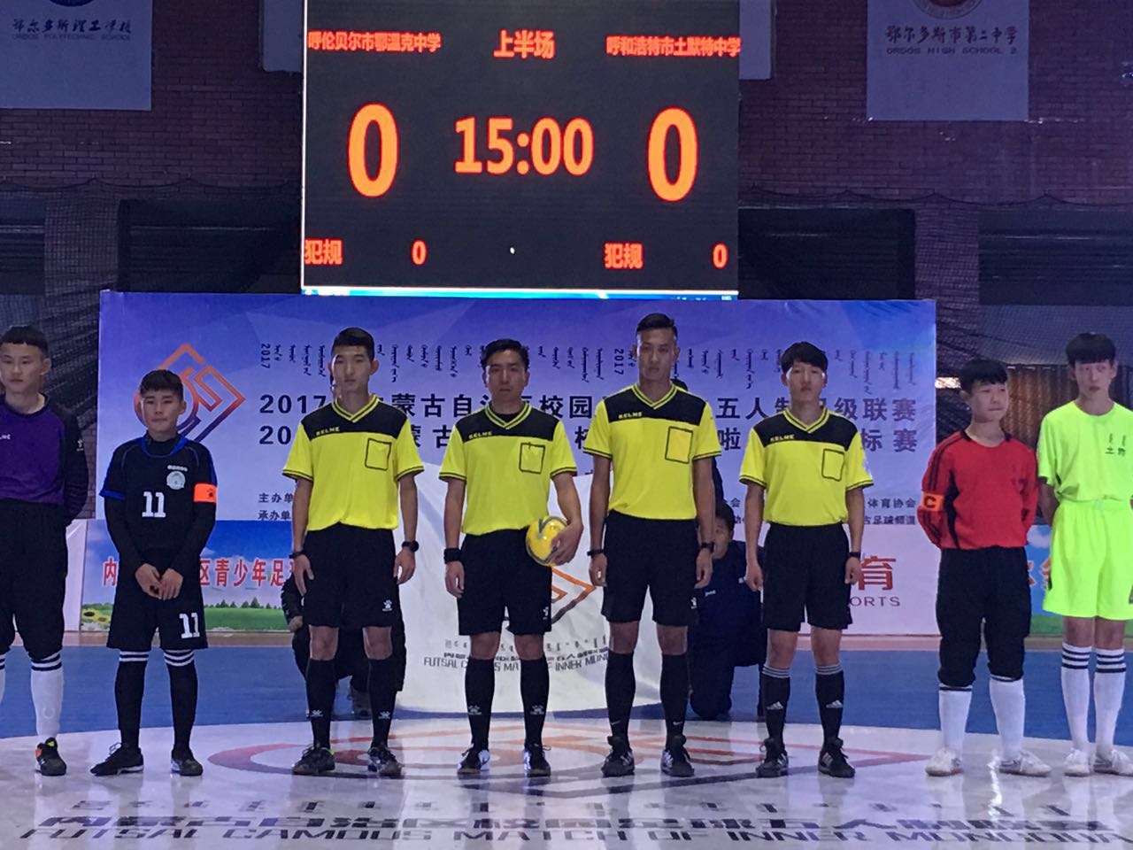 11月18日,2015级包金轩、刘占玉、崔轩玮同学执法内蒙古校园足球室内五甲联赛(初中组)。