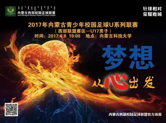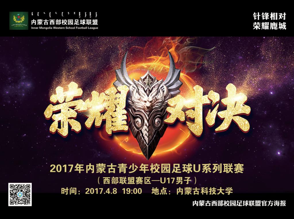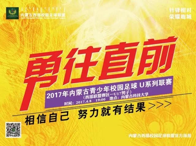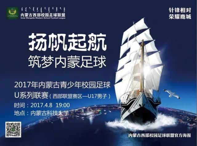 4月8日19:00分,2017年内蒙古自治区校园足球“西部联盟杯”校园足球联赛(U17男子组)揭幕战将在太阳集团主校区体育场举行,对阵双方由包头市主场迎战巴彦淖尔市。本次比赛由内蒙古自治区校园足球工作领导小组办公室主办,内蒙古西部校园足球联盟、包头市教育局、乌海市教育局、巴彦淖尔市教育局、阿拉善盟教体局承办,内蒙古自治区中学生体育协会、内蒙古校园足球联合会协办。