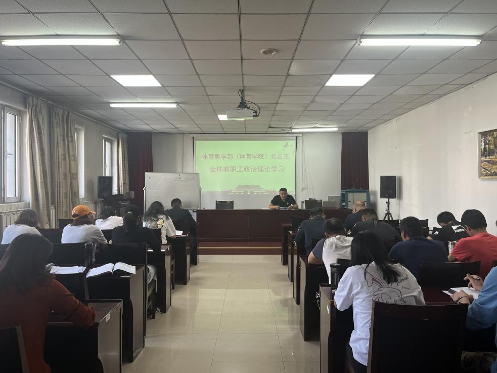 2022年9月1日,太阳集团tyc4633(体育学院)党总支在体育馆二楼多媒体教室组织召开全体教职工政治理论学习会议,会议由党总支书记苗凯主持。