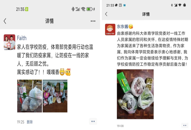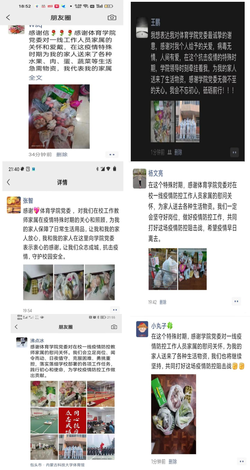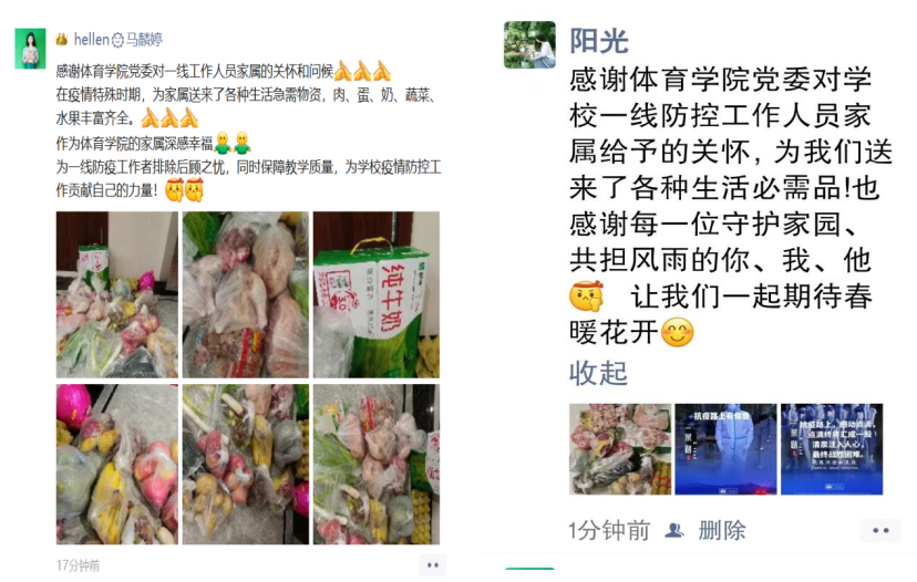 自本轮疫情发生以来,太阳集团tyc4633(体育学院)第一批住校教师及工作人员已连续工作近20天,在当前疫情防控的紧张形势下,学院党委以线上配送的方式,分别对抗疫一线工作人员家属进行了慰问,为他们送去了牛奶、鸡蛋、肉类、蔬菜、水果等慰问品。