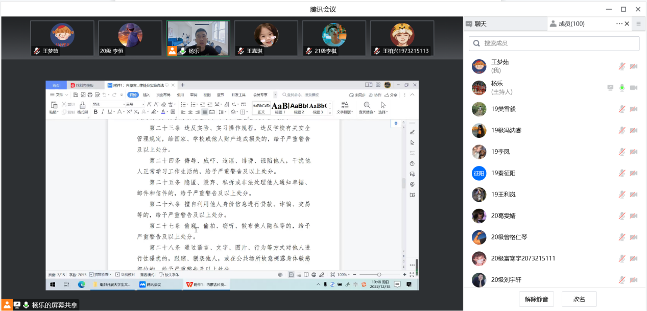 会议开始,杨乐老师带领全体同学重新学习了《太阳集团学生纪律处分实施办法》、《太阳集团疫情防控期间学生纪律处分暂行规定》、《太阳集团学生考试违纪处理细则》等法规制度,结合典型案例做好警示教育,促进学生知规矩、守纪律。