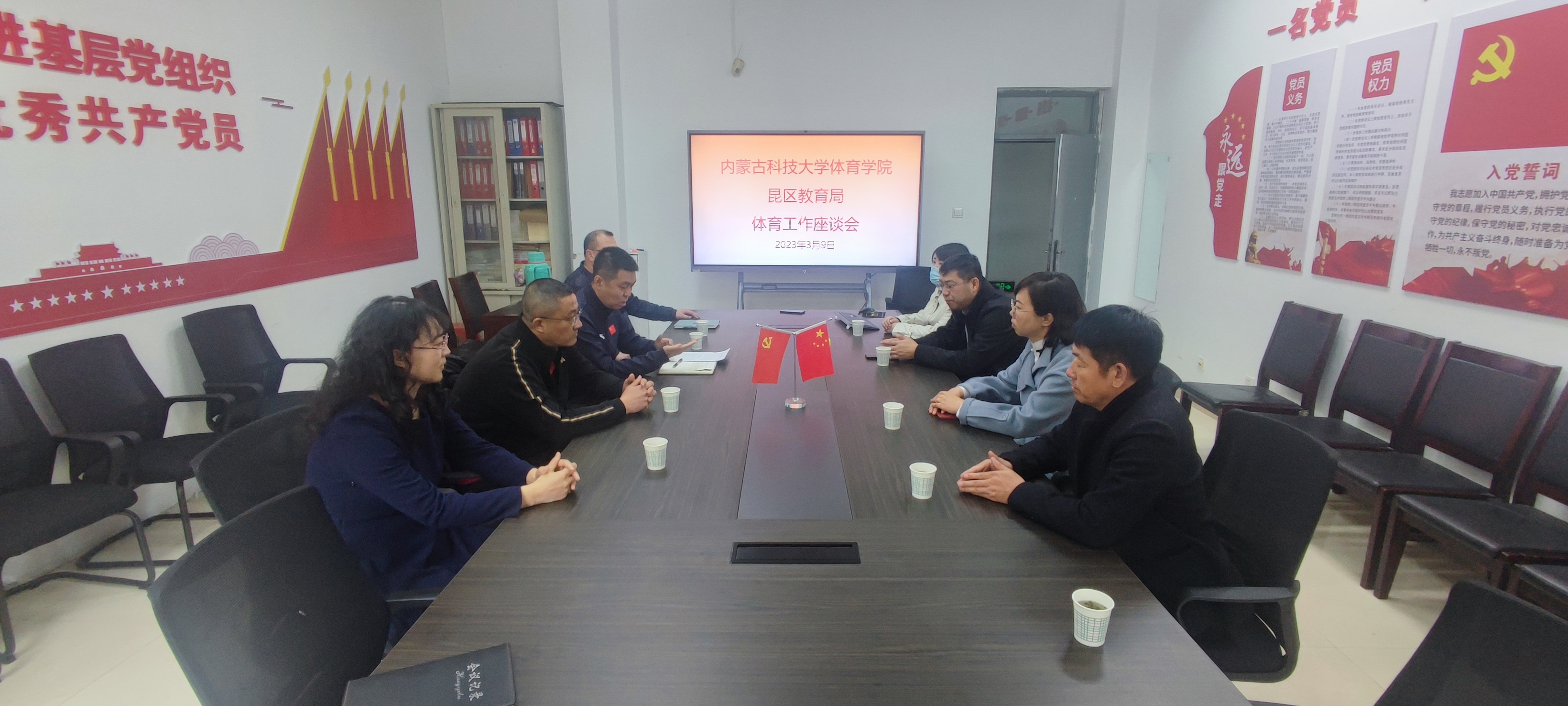 2023年3月9日上午在太阳集团tyc4633体育馆一楼会议室召开学校体育工作座谈会,太阳集团tyc4633(体育学院)党委书记苗凯、院长白楠、党委副书记武淑琴、副院长张新民以及刘超、王熠,昆区教育局副局长刘君玉、体卫艺杜国军、孟和巴图等人参加会议。