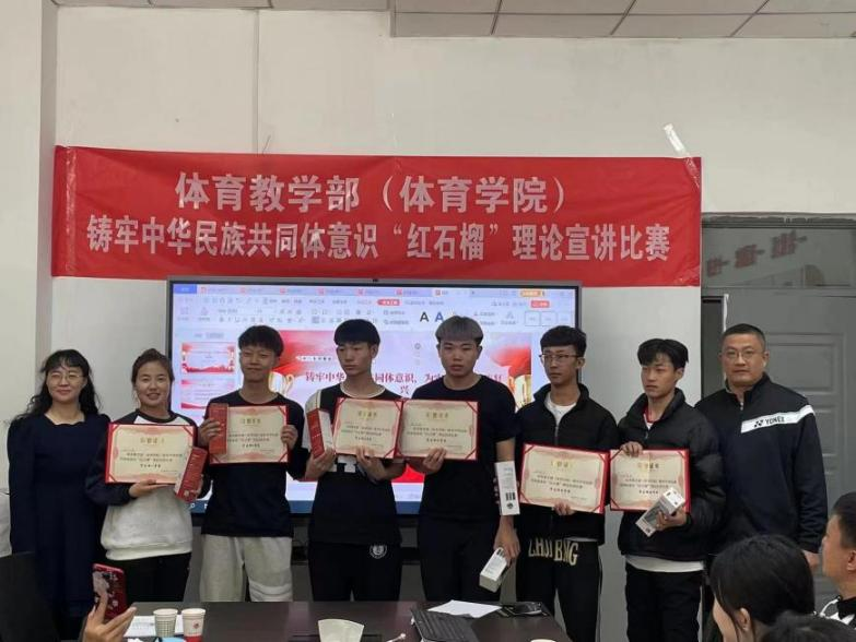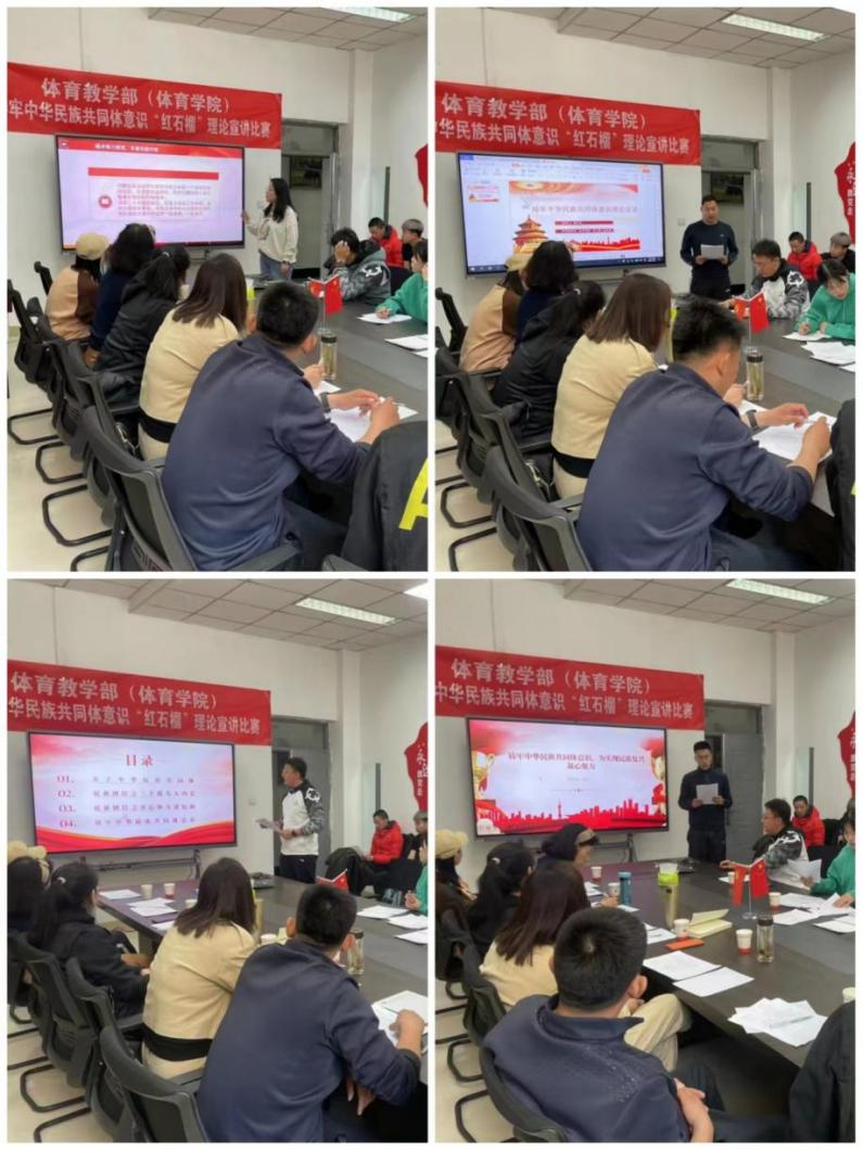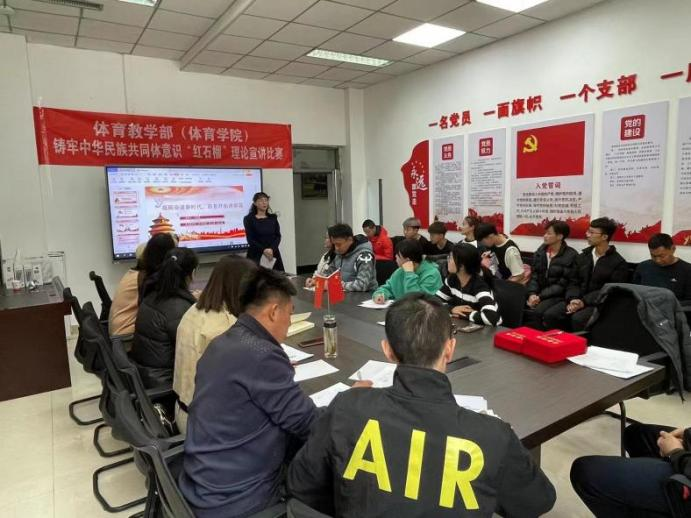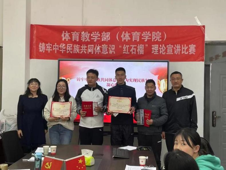 2023年3月15日,太阳集团tyc4633(体育学院)在一楼会议室组织召开铸牢中华民族共同体意识“红石榴”理论宣讲比赛。太阳集团tyc4633(体育学院)组织员褚亚飞主持,党委副书记武淑琴致开场词,比赛邀请了党委书记苗凯、李萍教授、张巨荣教授、苏笑朋教授、王建利老师、王熠老师、杨文亮老师担任评委,经过前期对教师组、学生组选拔,共有4位教师、6位学生参加比赛。
