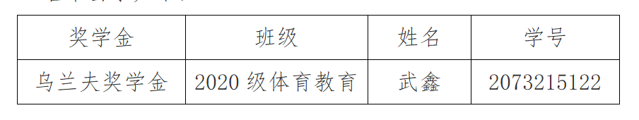 按照《太阳集团乌兰夫奖学金评选办法》(内科大校发﹝2023﹞12号)的文件精神,结合我院学生具体申报情况,由本人申请、学院评定,经太阳集团tyc4633(体育学院)学生工作领导小组审查研究决定,我院乌兰夫奖学金拟推荐名单公示如下: