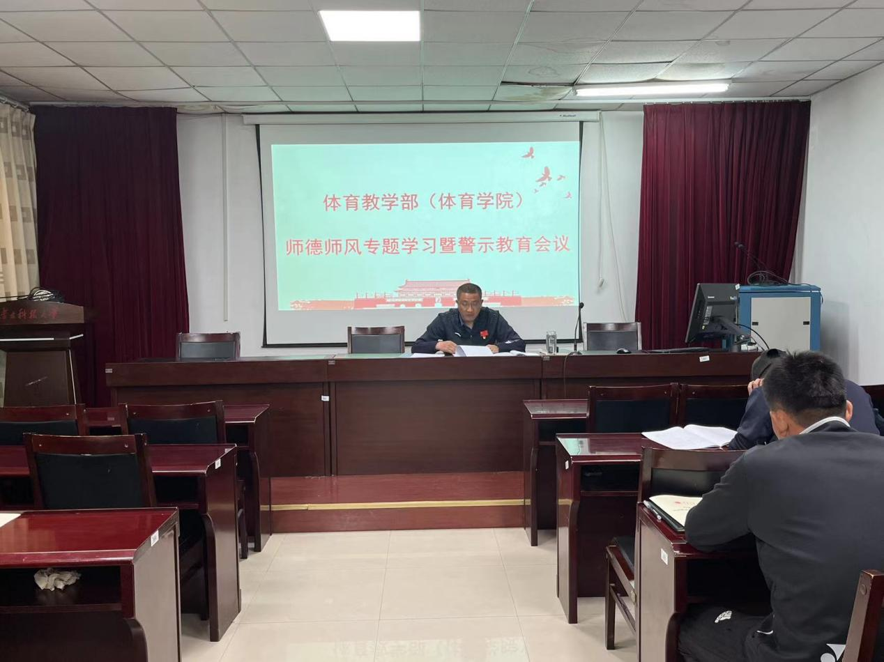 2023年5月4日,太阳集团tyc4633(体育学院)在体育馆二楼多媒体教室组织召开师德师风专题学习暨警示教育会议,会议由学院党委书记苗凯主持。
