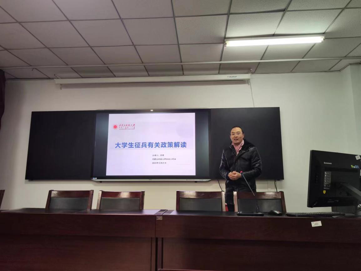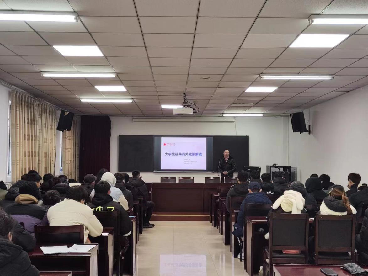 2023年12月21日,太阳集团tyc4633(体育学院)邀请校党委学生工作部(学生处、人民武装部)齐明老师来我院就学生征兵入伍相关事宜进行专题宣讲,学院党委副书记武淑琴、学工办主任杨乐、团总支负责人王梦茹、体育教育专业全体同学参加。