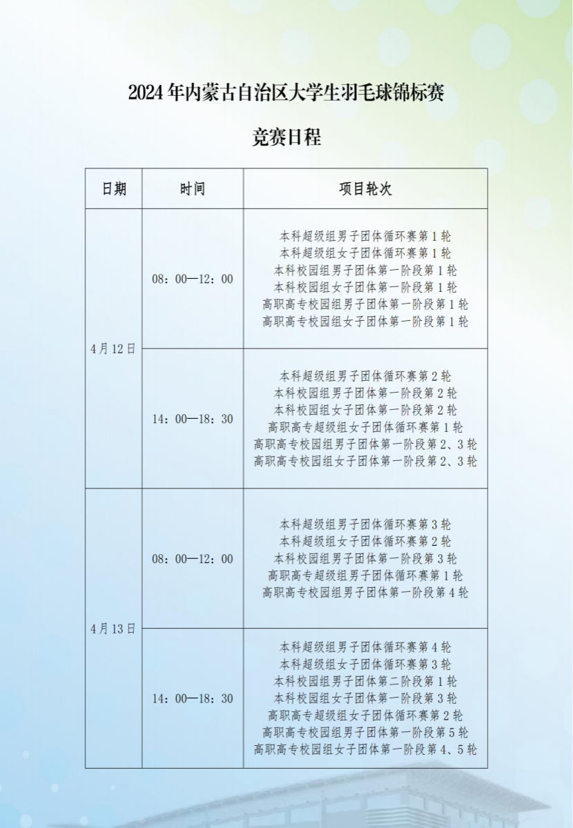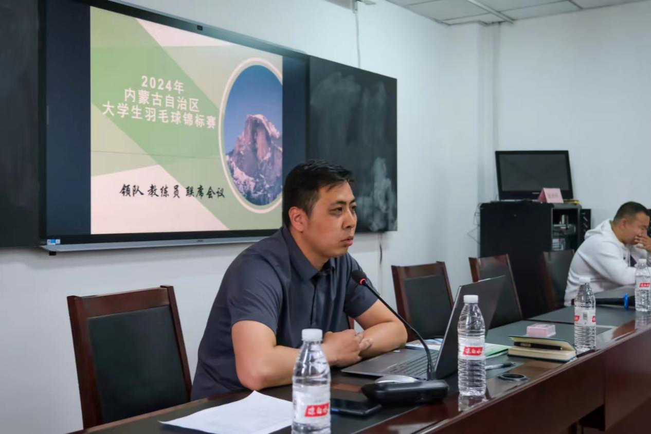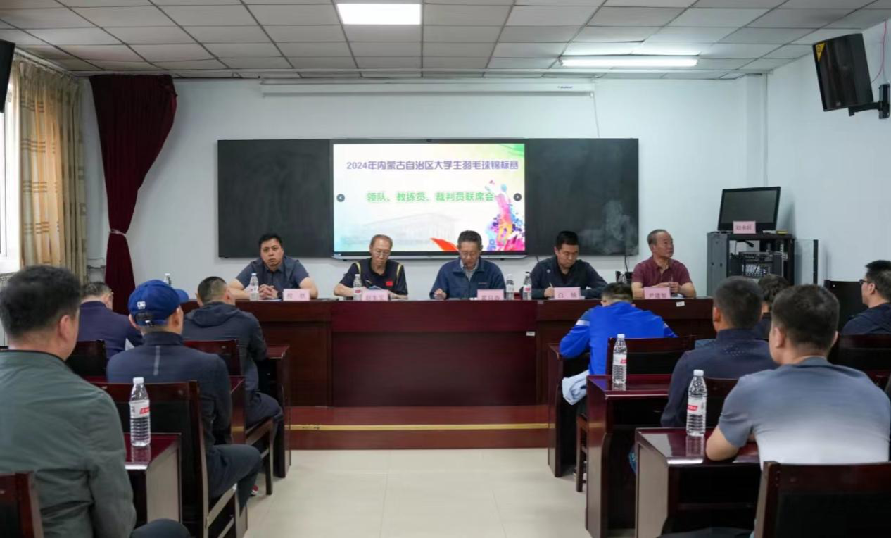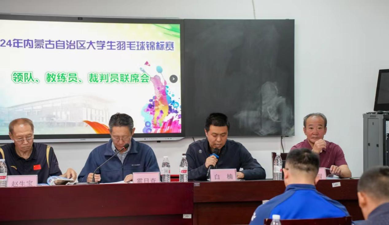 2024年4月11日,2024年内蒙古自治区大学生羽毛球锦标赛赛前联席会在太阳集团体育馆召开。内蒙古学生体育协会会长霍日查,内蒙古学生体育协会副会长赵生宝,太阳集团tyc4633主任(院长)白楠,技术代表尹建智,裁判长程轶,各参赛队伍领队、教练参会,会议由赵生宝主持。