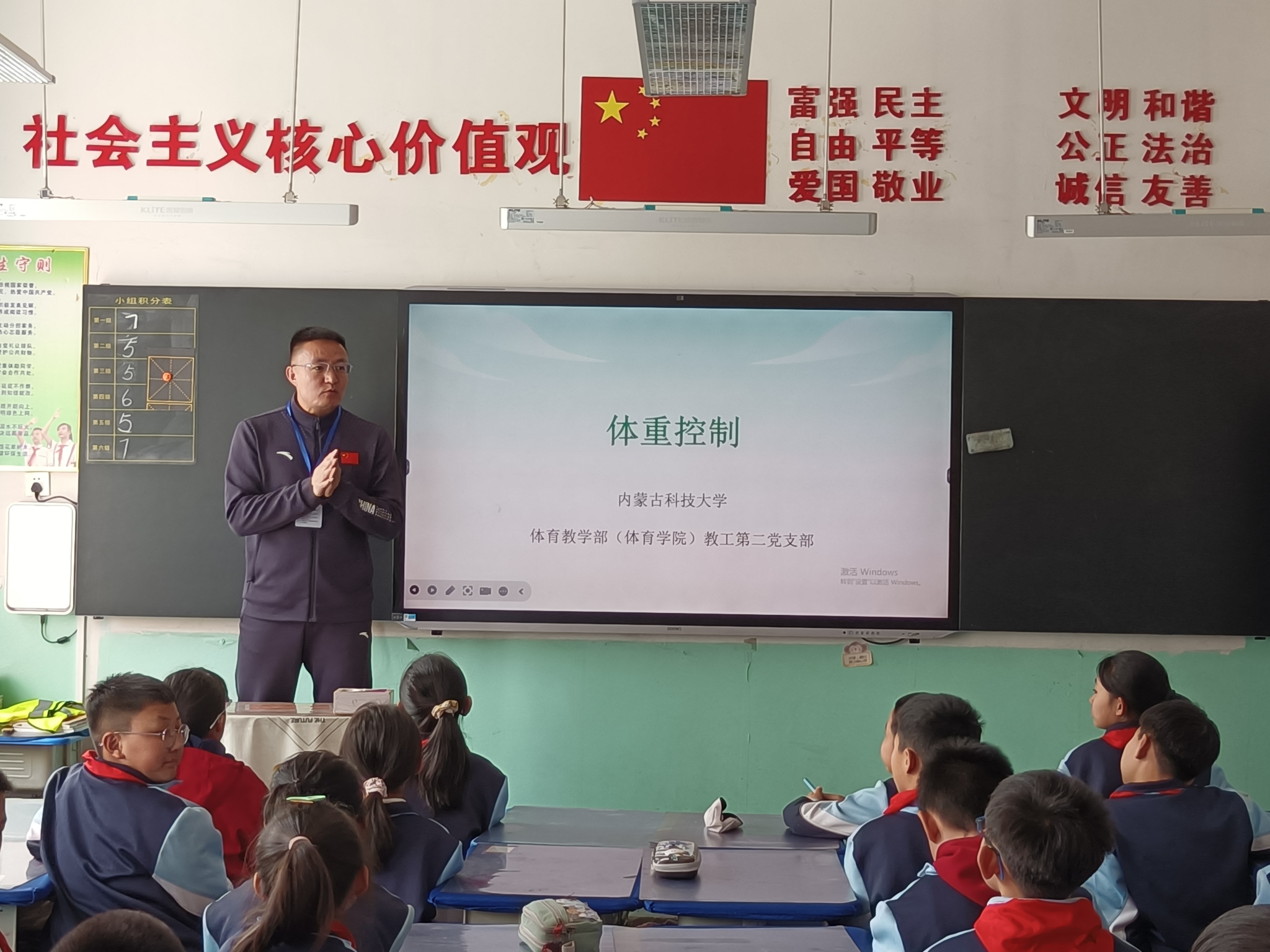 4月3日下午,太阳集团tyc4633教工第二党支部与昆区友谊大街街道办事处携手开展的“五进五认同”强基行动走进包头市昆都仑区友谊大街第十二小学,此次活动将室内体重管理讲座与室外花样跳绳活动相结合,为学生们带来了一场集知识与趣味于一体的健康盛宴。本次活动以铸牢中华民族共同体意识为主线,以共青团中央“伙伴计划”为载体,帮助孩子们养成健康积极的生活方式。