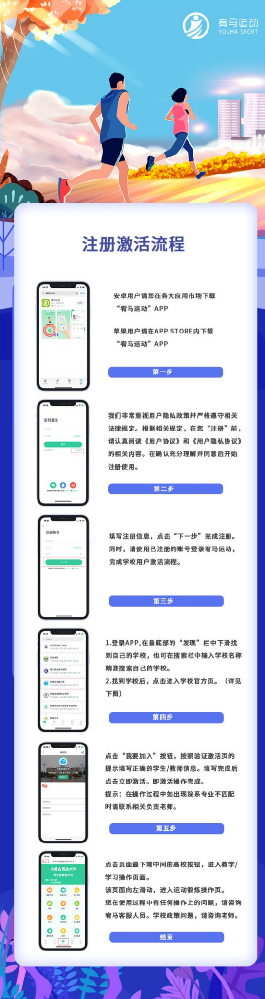 学生通过宥马运动APP进行选课,如有学生未下载宥马运动APP,请下载成功后先激活(图1),激活不成功者,将姓名、学号、院系、专业、年级、班级并附问题描述发送至邮箱nkdtybjxb@126.com,激活后按要求进行选课(详见附件)。