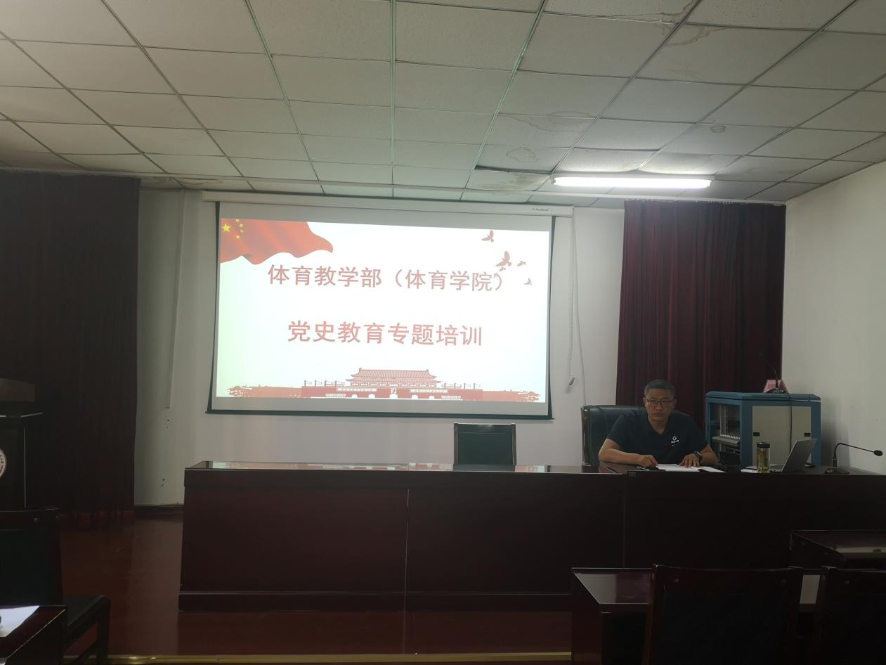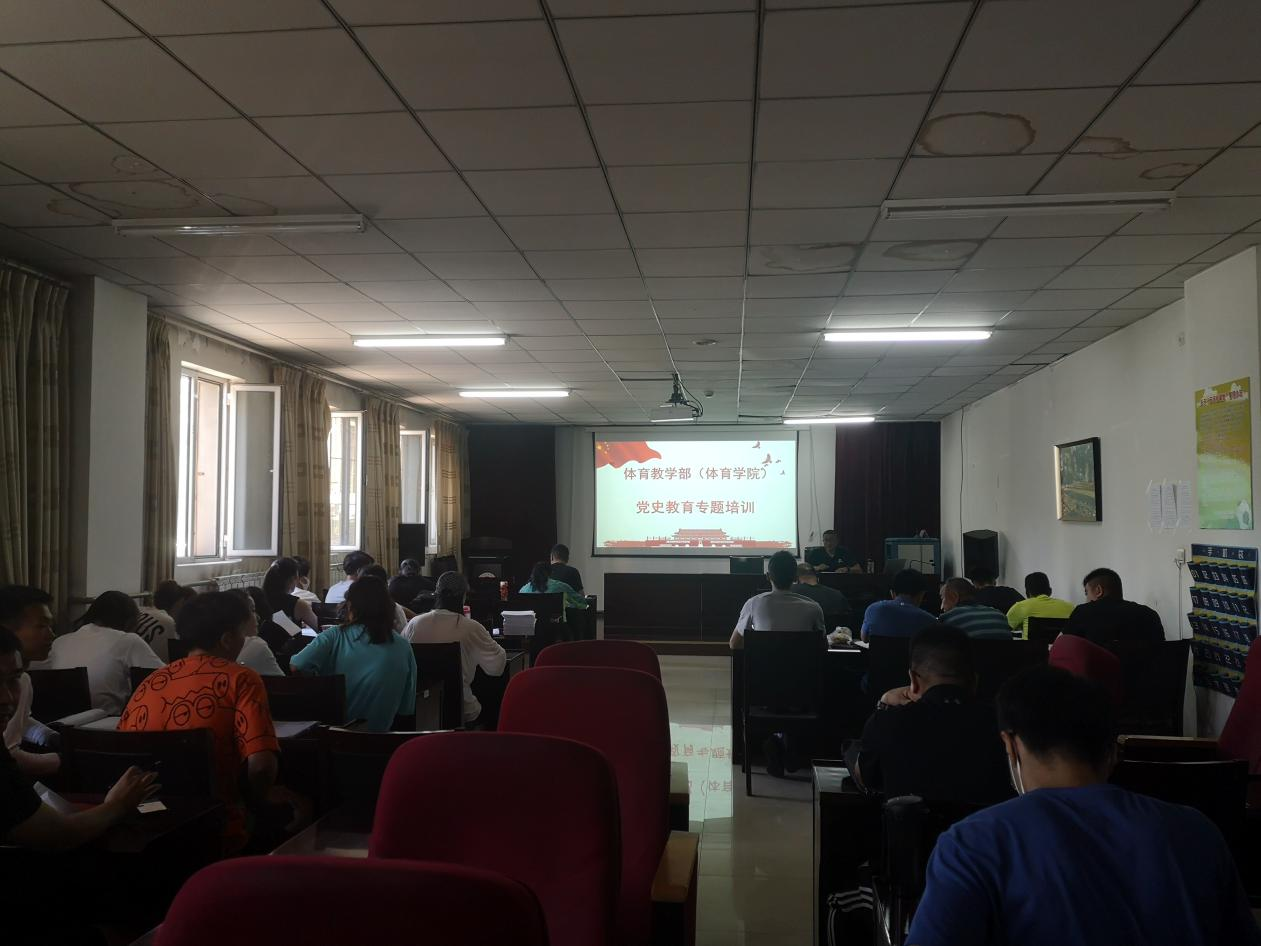 7月7日,太阳集团tyc4633(体育学院)党总支在体育馆二楼多媒体教室开展党史学习教育专题培训,全体教职工党员、学生党员和积极分子参加此次培训。