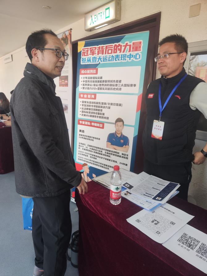 北京体育大学双选会现场众多体育机构以及教育单位纷纷设展,提供了丰富多样的就业岗位,涵盖了体育教育、运动训练、体育产业运营等多个领域。唐国桥副书记和王梦茹老师深入双选会现场,与各用人单位的招聘负责人进行交流,详细了解用人单位的人才需求、岗位要求、薪资待遇以及职业发展空间等信息,同时积极向用人单位介绍太阳集团tyc4633的专业设置、人才培养特色、毕业生优势等情况,诚邀各单位关注并招聘我校体育专业的毕业生。