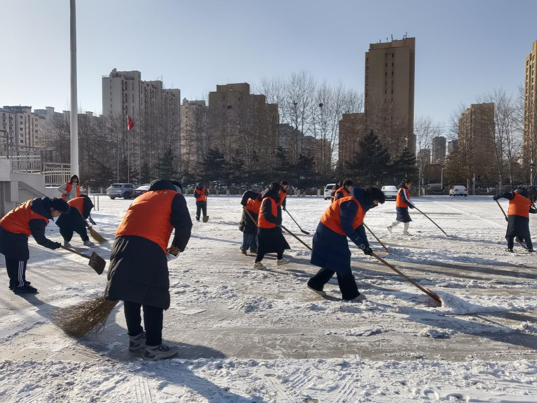 同学们按照预先划分的责任区域,携带铁锹、扫帚、推雪板等工具准时集结。各小组分工明确,配合默契,清扫现场学生志愿者们干劲十足,有的奋力铲除冻结的厚冰,有的仔细清扫台阶残雪,有的负责将积雪清运至指定地点。尽管寒风刺骨,许多人的脸颊和双手被冻得通红,但劳动的热情丝毫不减。经过连续两个小时的奋战,完成体育馆周围主要干道、操场门口积雪清除任务。